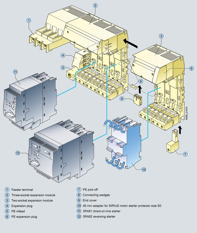 Система ввода для 3RA6 с нереверсивным компактным пускателем 3RA61; реверсивный пускатель  3RA62 и 45 мм адаптер для защиты пускателя SIRIUS