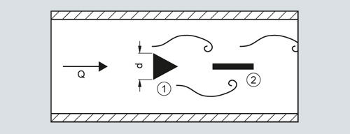 Вихревые расходомеры SITRANS F X скорость потока, определяя частоту, с которой последовательные завихрения срываются с плохо обтекаемого тела, помещенного в поток. Этот принцип измерения известен как принцип вихревой дорожки фон Кармана: последовательные завихрения, образующиеся за объектом в потоке. Частота последовательных завихрений пропорциональна скорости потока. Прохождение завихрения вызывает легкий нажим на крыло, помещенное за плохо обтекаемым телом. Этот нажим регистрируется, и учитывается как скачки давления двойным пьезо-кристаллом, помещенным внутри крыла.