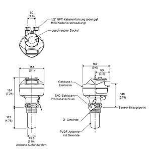 Установка SITRANS LR250 резьбовая PVDF антенна, размеры указаны в мм (")