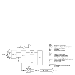 Измеренный сигнал от термометра сопротивления Pt100 (2, 3 или 4-провод. схема) усиливается на первом этапе. Напряжение, которое пропорционально входной переменной, затем преобразуется в цифровые сигналы мультиплексором в аналого-цифровом преобразователе. Они преобразуются микроконтроллером в соответствии с характеристиками сенсора и другими параметрами (диапазон измерения, демпфирование, температура окр. среды, и т.п.).