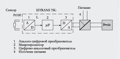 ФункцииИзмерительный преобразователь SITRANS TK-L преобразует сигнал от термометров сопротивления Pt100 в подводимый сигнал постоянного тока, соответствующий характеристике сенсора. Благодаря компактной конструкции он вставляется в головку зонда типа B (DIN 43 729).У программируемых SITRANS TK-L параметрирование осуществляется при помощи ПК Принцип работыПодаваемый с Pt100 (двух-, трех- или четырехпроводная схема) сигнал измерения усиливается на входном каскаде. Пропорциональное входной величине напряжение после этого преобразуется в аналого-цифровом преобразователе (1) в цифровые сигналы. В микропроцессоре (2) они пересчитываются в соответствии с характеристикой сенсора и прочими параметрами (демпфирование, сопротивлении линии и т.п.). Подготовленный таким образом сигнал преобразуется в цифрово/аналоговом преобразователе (3) в подводимый постоянный ток от 4 до 20 мА. Источник питания (4) находится в контуре выходного сигнала. | ||||||||||||||||||||||||||||||||||||||||||||||||||||||||||||||||||||||||||||||||||||||||||||||||||||||||||