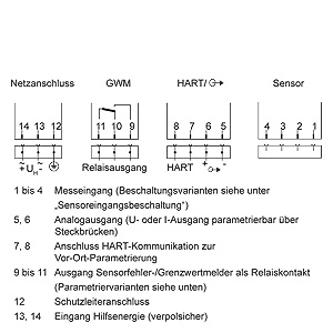 Рабочая индикация (4) показывает режим работы измерительного преобразователя (без помех или с помехами). Сигнализатор предельной величины (9) позволяет сигнализировать ошибки сенсора и/или положительное или отрицательное превышение предельной величины. Через контрольное гнездо (12) на выходе тока с помощью измерительного прибора можно контролировать ток.