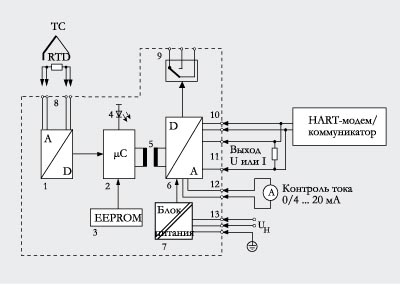 Подаваемый с потенциометрического датчика (двух-, трех-, четырехпроводная схема), датчика напряжения, датчика тока или термопары сигнал измерения преобразуется в аналого-цифровом преобразователе (1, функциональная схема) в цифровой сигнал. Он анализируется в микроконтроллере (2), корректируется в соответствии с характеристикой сенсора и преобразуется в цифрово-аналоговом преобразователе (6) в выходной ток (0/4 до 20 мА) или выходное напряжение (0/2 до 10 V). Характеристики сенсора, а также параметры электроники и данные для параметрирования измерительного преобразователя фиксируются в энергонезависимой памяти (3).