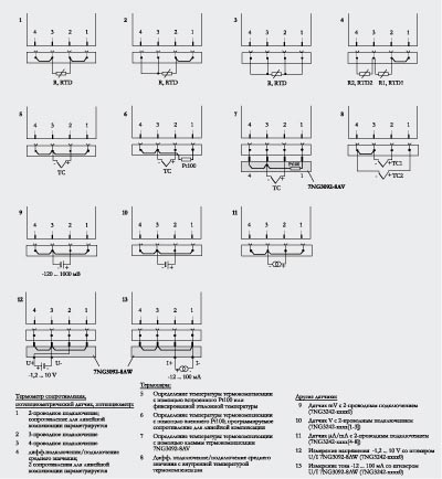 SITRANS TW, 4-х проводный прибор с несущей шиной - это измерительный преобразователь с универсальной входной схемой для подсоединения к следующим чувствительным элементам и источникам сигнала: