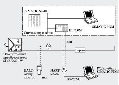 ИнтеграцияКонфигурация системыВозможные системные конфигурации Измерительный преобразователь SITRANS TW, 4-х проводный прибор с несущей шиной, может использоваться во множестве системных конфигураций: как отдельный прибор, часть ПАЗ и системы регулирования, например SIMATIC S7. При этом присутствует вся приборная функциональность посредством согласно HART-протокола. Через HART-интерфейс возможна коммуникация по выбору с: