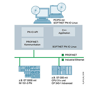 С помощью программного обеспечения SOFTNET PN IO Linux компьютер может быть связан с приборами полевого уровня PROFINET, включая компьютерные приборы ввода-вывода (например, с коммуникационными процессорами CP 1616 или CP 1604), через Industrial Ethernet.