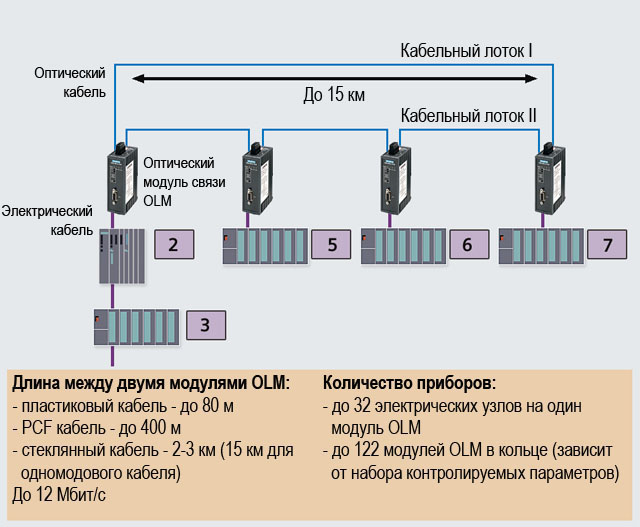 OLMы могут быть объединены друг с другом и отдельными станциями, или полные электрические сегменты могут быть интегрированы в оптическую сеть PROFIBUS через электрический интерфейс.