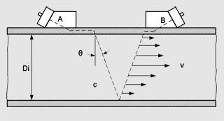 ФункцииOperating PrincipleThe SITRANS FUS1010 system is a transit-time ultrasonic meter that provides exceptional performance using a non-invasive clamp-on approach. Ultrasonic transducers transmit and receive acoustic signals directly though the existing pipe wall, where the fluid refraction angle is governed by Snell’s law of refraction. Clamp-on transducer mounted in a reflect configuration The beam refraction angle is calculated as follows: sin Ө = c / Vφ c = Velocity of sound in fluid VФ = Phase velocity (a constant in the pipe wall) The flowmeter automatically compensates for any change in fluid sound velocity (or beam angle) in response to variations in the average transit-time between transducers A and B. By subtracting the computed fixed times (within the transducers and pipe wall) from the measured average transit-time, the meter can then infer the required transit-time in the fluid (TFluid). The Sound waves traveling in the same direction as flow (TA,B) arrive earlier than sound waves traveling against the direction of flow (TB,A). This time difference (Δt) is used to compute the line integrated flow velocity (v) as shown in the equation below: v = VФ / 2 · Δt / TFluid Once the raw flow velocity is determined, the fluid Reynolds number (Re) must be determined to properly correct for fully developed flow profile. This requires the entry of the fluid’s kinematic viscosity (visc) as shown in the equations below, where Q represents the final flow profile compensated volumetric flow rate. Re = Di · vФ / visc Q = K(Re) · ( π / 4 ·Di2 ) · vФ v = Flow velocity visc = μ / ρ = (dynamic viscosity / density) K(Re) = Reynold flow profile compensation In all wetted type ultrasonic flowmeters the meter constants are configured prior to leaving the factory. As this is not possible with clamp-on meters, the settings must be made by the customer at the time of installation. These settings include pipe diameter, wall thickness, liquid viscosity, etc. SITRANS Clamp-On meters that include temperature sensing can be configured to dynamically infer changes in fluid viscosity for the purpose of computing the most accurate flow profile compensation (KRe). Ultrasonic Transducer Types Two basic types of Clamp-On transducers can be selected for use with the SITRANS FUS1010 flowmeter. The lower cost “universal” transducer is the most common type in the industry and is suitable for most single liquid application where the sound velocity does not vary much. This transducer type can be used on any sonically conductive pipe material (including steel) making it well suited for portable survey applications. Universal transducers are selected based on the pipe diameter range alone, so wall thickness is not important to the selection process. The second transducer type is the patented WideBeam transducer (called high precision), which utilizes the pipe wall as a kind of loudspeaker to optimize the signal to noise ratio and provide a wider area of vibration. This makes this kind of transducer less sensitive to any change in the fluid medium. The WideBeam transducer is designed for steel pipes, but can also be used with aluminum, titanium and plastic pipe. It is the preferred transducer for HPI and gas applications. Note that unlike the universal type, this transducer selection is dependent only on the pipe’s wall thickness. Automatic Zero Drift Correction (ZeroMatic Path™) When WideBeam transducers are installed in the “Reflect” mode configuration shown below, the acoustic signal travels in two different paths between transducers A and B. One path “ACB” travels through the pipe wall and fluid, while the other path “AB” never enters the fluid medium. This later path provides the meter with a reference signal that is completely independent of flow rate and can therefore be used as a measure of transducer “mis-match”. By continually analyzing this pipe wall signal the FUS 1010 meter can dynamically correct for flow errors caused by zero drift. Multi-Channel Flowmeters For improved flow profile averaging, redundancy, or better cost per measurement, Clamp-On meters can be supplied with 1 or 2 measurement channel, with 4 channel meters supplied as special order. In the standard FUS, FUP, FUE systems, these channels can be installed on separate independent lines or in a multi-beam installation as shown below. This choice is made during meter setup, where either a multi-beam (two beams on same pipe) or multi-channel installation can be selected. Dual Beam installation example Doppler (Reflexor®) Operation The Doppler measurement technique relies on the reflection of sound energy off tiny gas bubbles or suspended particles to create a doppler shift in the fixed frequency acoustic transmit signal, as shown below. When de-demodulated using FFT signal processing, this doppler shifted frequency (Δf) can be used to measure the flow rate as described in the associated doppler equations below. Although the standard transit-time measurement system is very tolerant of high levels of liquid aeration and high solids content, there will be cases where insufficient signal will be available for operation with transit-time mode. For these cases the FUS, FUP and FUE meters can be ordered with this optional doppler capability, which requires an additional doppler transducer. SITRANS meter family descriptionSITRANS FUS1010 flowmeters The FUS1010 system is a basic function permanent (or dedicated) clamp-on meter that is available with a full range of safety approvals, I/Os and enclosure types. This meter can be used in a wide range of applications but does not include the special functions found in the hydrocarbon FUH and energy FUE flowmeters. The FUS1010 meter is typically programmed with a fixed viscosity and specific gravity entry, which can limit the mass flow and volumetric flow accuracy when highly variable (multi-product) liquid properties flow through the same pipeline. If this me