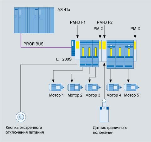 Это приводит к разнообразию возможностей применения. Несколько безопасных контуров могут быть разработаны без проблем. Типичные примеры реализаций, представлены в руководстве "SIMATIC ET 200S motor starters".