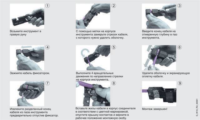 - Все монтажные операции производятся с использованием специального инструмента для быстрого удаления изоляции.
