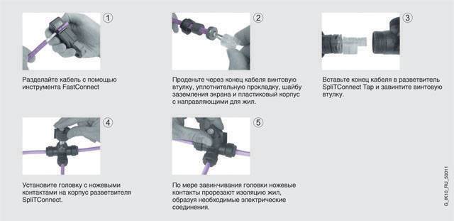 - Электрическое соединение цепей методом прокалывания изоляции FC кабеля при установке головки с контактными ножами.