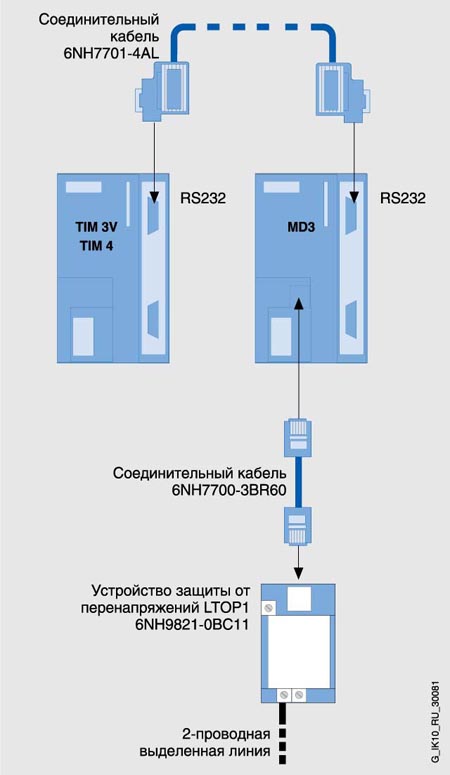 На приведенном ниже рисунке показан пример соединения сетевых компонентов при терминальном подключении 2-проводной выделенной линии связи. Соединительный кабель 6NH7 700-3BR60 входит в комплект поставки модема MD3.