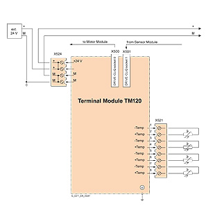 Через терминальный модуль TM120 возможна обработка 4 датчиков температуры (KTY84-130 или PTC). Входы датчиков температуры безопасных электрически разделены с электроникой формирования сигнала в терминальном модуле TM120 и подходят для обработки температуры специальных двигателей, к примеру, линейных двигателей 1FN и встраиваемых моментных двигателей 1FW6. Терминальный модуль TM120 может работать на управляющем модуле CU320-2 от версии микропрограммного обеспечения 4.3.