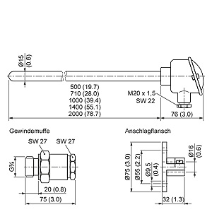 Термометр сопротивления для дымового газа с соединительной головкой, размеры в мм (дюймах)