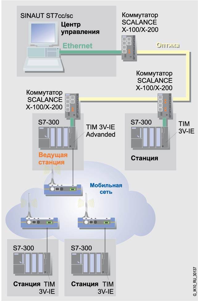 Подключение к Industrial Ethernet и TCP/IP сетям Модуль TIM 3V-IE Advanced оснащен не только интерфейсом RS232, но и гнездом RJ45 для подключения к сети Ethernet на основе TCP/IP с фиксированными IP адресами, подобной выделенной линии. В зависимости от конкретных условий применения в сети Ethernet могут использоваться: - Коммутаторы SCALANCE X для оптических и электрических (витая пара) каналов связи