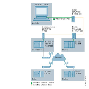 В режиме узлового терминала модуль TIM 3V-IE Advanced способен поддерживать обмен данными через интерфейс RS232, например, с терминалами более низкого уровня через радиоканалы. Подключение к центру управления выполняется через интерфейс RJ45, коммутатор SCALANCE X и оптический Ethernet кабель. В данной конфигурации поддерживается обмен между любыми SINAUT станциями независимо от того, к какой сети они подключены.