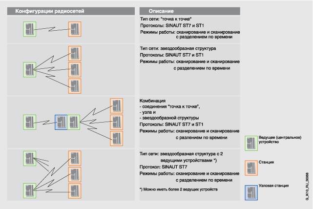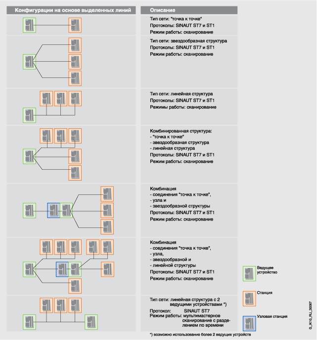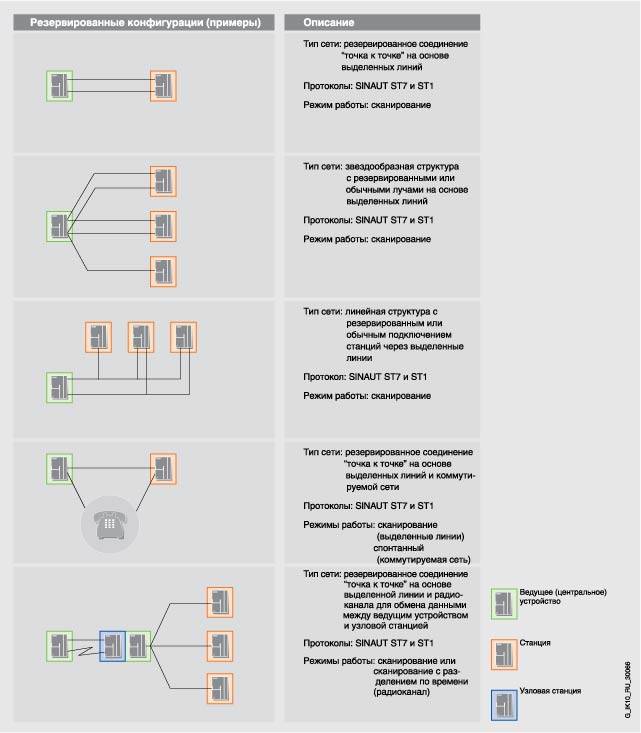 Обзор показывает сетевые конфигурации, возможные с SINAUT в WAN. Для каждой сетевой конфигурации показаны используемые SINAUT протоколы и режимы работы для коммуникаций по каждой сети. Симовлы описыват функциональность портов WAN на модуле TIM. Модуль TIM 3 имеет один WAN порт, TIM 4 - два WAN порта. Два порта на TIM 4 могут выполнять одинаковые (например, 2 x мастер) или разные (например, узел + мастер) функции. При резервированных WAN соединениях всегда необходимо использовать TIM 4 с двумя портами, т.к. резервированное соединение всегда начинается/заканчивается на модуле TIM.