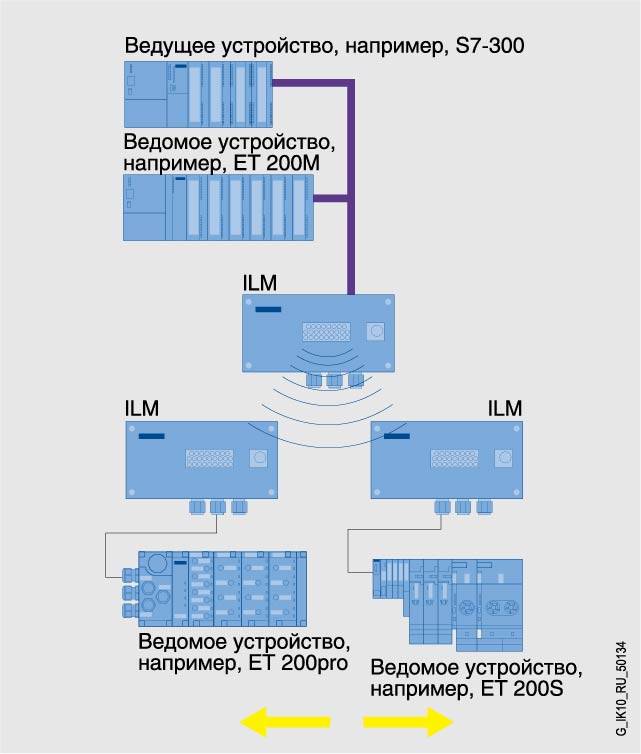 Пример оптической сети PROFIBUS Смешанные конфигурации Сеть PROFIBUS позволяет объединять до 127 станций. Для объединения этих станций могут использоваться смешанные конфигурации, объединяющие в своем составе различные типы каналов связи. Совместное использование различных типов каналов связи существенно расширяет возможные сферы применения PROFIBUS, позволяет максимально адаптировать сеть к требованиям конкретного применения. Пример смешанной сети PROFIBUS Безпроводные сети Инфракрасные каналы используются для организации беспроводной связи и позволяют передавать данные на расстояние до 15м. Такие каналы являются наиболее эффективным решением для обмена данными с аппаратурой, расположенной на подвижных частях технологического оборудования. Скорость передачи данных может достигать 1.5Мбит/с. Для передачи данных по инфракрасным каналам применяются модули ILM (Infrared Link Module – инфракрасный модуль связи). Пример безпроводной сети PROFIBUS |