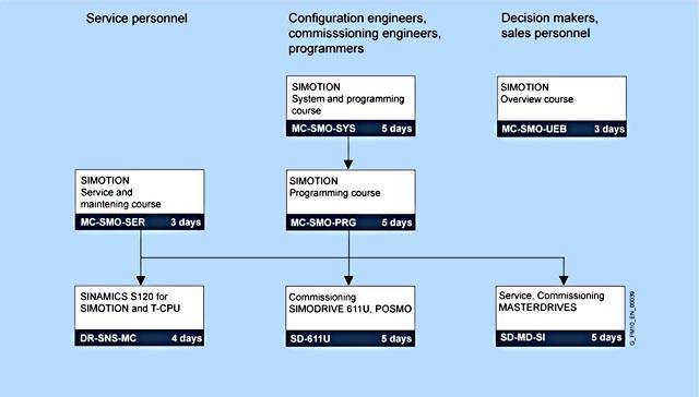 Наряду со стандартными курсами в наших центрах обучения проводятся индивидуальные курсы, которые адаптированы к специфическим потребностям наших клиентов и могут проводиться по желанию также на предприятии заказчика. Ниже представлены наши предложения по обучению для SIMOTION. Дополнительные сведения Вы можете найти в каталоге ITC. Курсы обучения по SIMOTIONМы предлагаем Вам следующие курсы для системы Motion Control SIMOTION: SIMOTION обзор MC-SMO-UEB Этот курс предназначен специально для руководства и сотрудников сбыта, которые хотят получить в краткой форме общее представление о системе Motion Control SIMOTION. Упражнения и примеры способствуют практическому освоению системы инжиниринга SIMOTION SCOUT. SIMOTION обзор системы и программирование MC-SMO-SYS Этот курс предназначен для наладчиков, проектантов, программистов и специалистов сервиса. Он дает необходимые знания для начала работы с системой Motion Control SIMOTION, ее конфигурирования, программирования и ввода в эксплуатацию. Практические упражнения курса выполняются на стендах с контроллером SIMOTION C230-2 и дополняют программу курса опытом практической работы с устройством. Курс предоставляет необходимую основу для дальнейших углубленных курсов. SIMOTION программирование MC-SMO-PRG Курс дает возможность программистам и пользователям SIMOTION углубить свои знания по программирования на языках Structured Text (СT) и Motion Control Chart (MCC). При помощи ориентированных на практику примеров создаются прикладные программы и указываются стратегии поиска решения для программирования SIMOTION и его функций. SIMOTION сервис и обслуживание MC-SMO-SER Этот курс ориентирован на сотрудников сервиса и ввода в эксплуатацию и предполагает знания в обращении с SIMOTION в объеме курса Обзор системы. Цель курса - познакомиться с вводом в эксплуатацию компонентов и возможностями диагно- стирования SIMOTION. Для этого подробно изучаются конструктивные особенности и функции аппаратных платформ SIMOTION C230-2 и SIMOTION P350 а также система инжиниринга SIMOTION SCOUT, а также рассматриваются примеры и упражнения по возможностям диагностирования. Контактная информацияЕсли Вы имеете вопросы по курсам, то свяжитесь пожалуйста с нами: Офис обучения Infoline: (01 805) 235611 или посетите наш сайт в Интернете. Дополнительную информацию Вы можете получить в Интернете по адресу. You will find details on all our courses including scheduled dates, availability, and other information. Siemens AG Тел.: +49 (0) 18 05 23 56 11 Учебный центр A&D в России: Тел.: +7 495 737 23 88