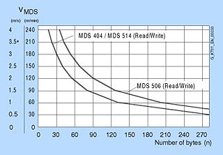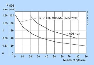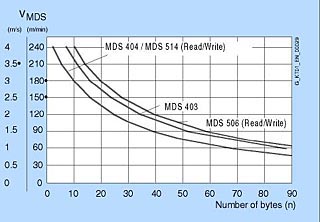 Показанные здесь кривые предназначены для того, чтобы помочь в выборе мобильных накопителей данных и устройств записи/чтения для MOBY I для динамических приложений. Эти кривые пригодны для вертикального режима с однократной длиной окна передачи (L) и рабочим расстоянием (Sa).