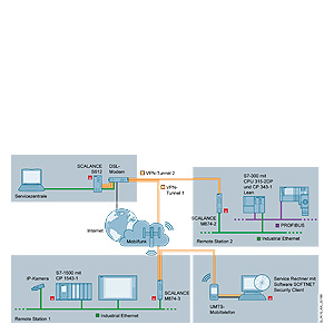 Классические приложения для дистанционного программирования, настройки параметров и диагностики, а также мониторинга удаленных машин и установок могут использовать защищенные VPN соединения с сервисным центром через Интернет. Обеспечение доступа к любым приборам со своим IP адресом, в том числе и к программируемым контроллерам, подключенным к SCALANCE M874 по локальной сети.