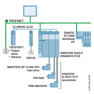В представленной концепции автоматизации как аппаратная платформа выбрана SIMOTION D с системой привода SINAMICS S120. Как управление машины, так и технологические функции программируются на SIMOTION D, управляются и контролируются через децентрализованную периферию ET200. Через встроенные в привод быстрые модули периферийных устройства TM15 или TM17 управляются кулачки и соответственно принимаются сигналы быстрых датчиков для контроля процесса. Двигателем управляет модуль двигателя SINAMICS S120.