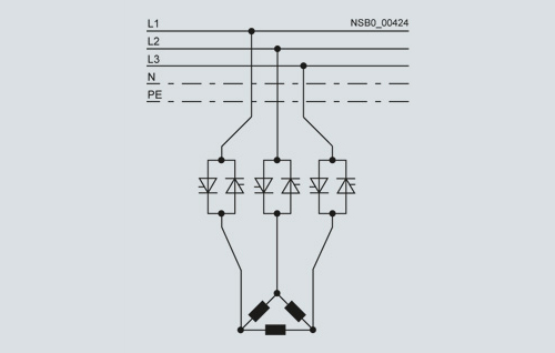 Номинальный ток Ie coответствует примерно 58 % номинального тока двигателя In, 6 проводников к двигателю (как устройство запуска «звезда-треугольник»)
