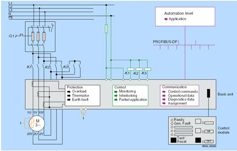 Базовый модуль, модуль расширения и модуль управления SIMOCODE-DP Микропроцессорный аппарат защиты и управления двигателями SIMOCODE-DP 3UF5 используется в основном в низковольтных распределительных устройствах для силовых шкафов управления двигателями в непрерывных процессах, и представляет собой интеллектуальное связующее звено между фидером двигателя (двигатели с постоянной частотой вращения) и автоматизированной системой управления процессом. Эта техника позволяет повысить коэффициент готовности оборудования и одновременно сберечь средства на ввод в эксплуатацию, пуск и эксплуатационное обслуживание производственной линии. SIMOCODE-DP решает самые различные задачи: