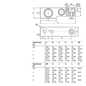 | Номинальная нагрузка [t] | A [мм] | B [мм] | C [мм] | D [мм] | E [мм] | ∅F [мм] | G [мм] | H [мм] | J [мм] | ∅K [мм] | ∅L [мм] | M [мм] |