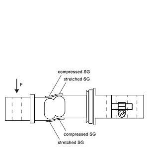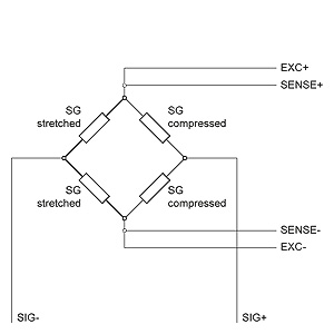 Весоизмерительные ячейки - это датчики, преобразующие механическую величину (вес) в электрический сигнал.Основным элементом является специальное пружинное тело, на котором расположены динамически привязанныеизмерительные полоски (DMS). DMS состоят из тонкого изоляционного материала, который интегрирована резистивная пленка.Под действием веса F пружинное тело деформируется (см. принципиальную схему), а вместе с ним и DMS. При изменении внешней формы DMS меняется и омическое сопротивление ее проводника. Верхняя левая и нижняя правая DMS cплющиваются, их резистивная пленка сокращается, а омическое сопротивление соответственно уменьшается. Верхняя правая и нижняя левая DMS растягиваются, их резистивная пленка расширяется, а омическое сопротивление увеличивается.В каждой измерительной ячейке имеется минимум четыре DMS, подключенных таким образом, что вместе они составляют полноценный мост Уитстона. Растянутые и сплющенные DMS подключены так, что положительные или отрицательные изменения сопротивления прибавляются к общему рассогласованию моста. На одну диагональ моста подается напряжение питания (при 6-проводной технологии также и напряжение датчика, SENSE), а с другой диагонали снимается измерительноенапряжение. При постоянном напряжении питания (EXC) измерительное напряжение (SIG) изменяется пропорционально поданной нагрузке.