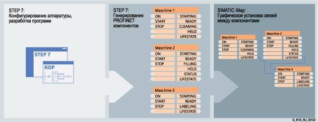 PROFINET с распределенными полевыми устройствами Системы управления с распределенным интеллектом на базе PROFINETPROFINET обеспечивает поддержку распределенных систем управления, базирующихся на использовании технологии CBA – технологии модульного построения систем управления машинами и предприятиями в рамках единой концепции Totally Integrated Automation. Обеспечивается возможность интеграции существующих решений на базе PROFIBUS в системы PROFINET CBA. PROFINET определяет инженерную модель построения интерфейса и обмена данными между компонентами CBA. С помощью STEP 7 могут создаваться технологические компоненты с интерфейсом обмена данными с другими модулями. С помощью пакета SIMATIC iMAP выполняется графическое проектирование PROFINET систем связи, а также их диагностика. Для построения систем PROFINET CBA могут использоваться: