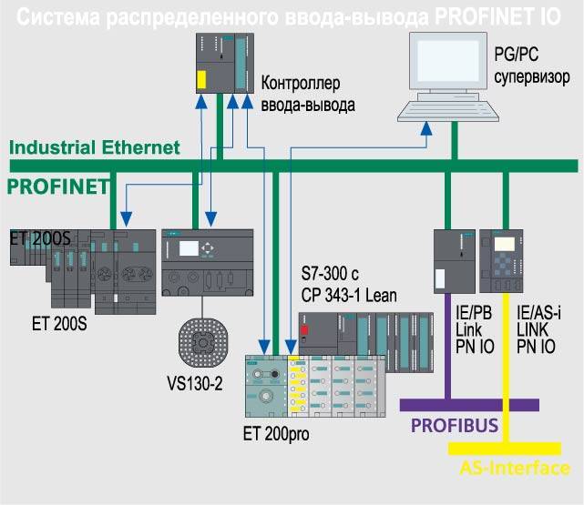 Системы распределенного ввода-вывода на базе PROFINETPROFINET позволяет создавать системы распределенного ввода-вывода, в которых приборы полевого уровня подключаются непосредственно к сети Industrial Ethernet и обслуживаются PROFINET контроллером ввода-вывода. Конфигурирование такой системы выполняется из среды STEP 7. Поддерживается возможность дальнейшего использования существующей аппаратуры полевого уровня, например, аппаратуры PROFIBUS. В системах распределенного ввода-вывода PROFINET могут использоваться: