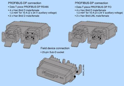 Приводы/датчики (Actuators/sensors) Подключаются через M12 круглый кабельный соединитель Т-образные соединители для шины данныхТ-образные соединители для шины данных Т-образные соединители для шины данных подключают отдельные полевые устройства к PROFIBUS DP. Они определяют среду передачи (FO или RS 485)для полевых устройств. Сами полевые устройства нейтральны по отношению к способу передачи данных. Существуют два T-образных соединителя в системе ECOFAST:
