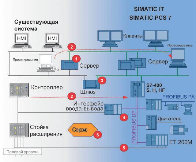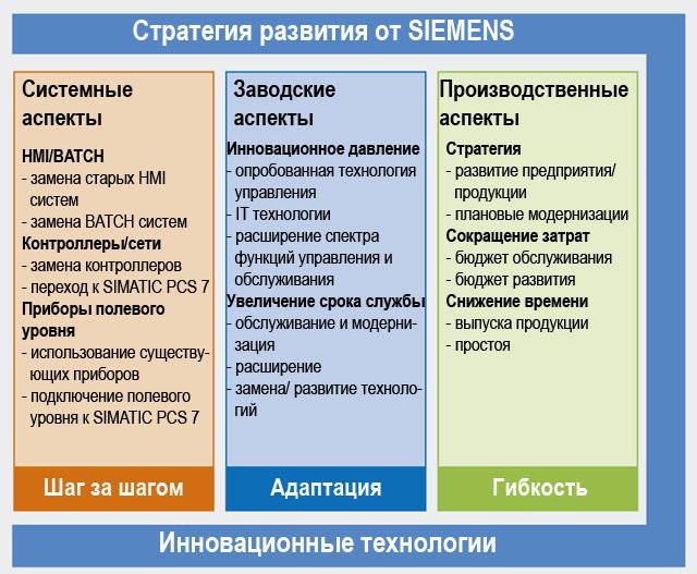 Стратегия развитияПостоянно увеличивающееся давление конкурентной борьбы вынуждает компании непрерывно повышать производительность и сокращать время выпуска своей продукции на рынок. Для снижения затрат на выпуск продукции необходимо все время оптимизировать процессы разработки и другие процессы. Глобализация, новые промышленные требования и директивы заставляют предприятия искать новые инновационные решения в своих областях. Для гарантированного выпуска современной конкурентноспособной продукции множество существующих систем и предприятий требуют всесторонней модернизации и расширения. Этой модернизации подвергается базовая аппаратура, прикладное программное обеспечение и технологии, а также процессы проектирования, управления и обслуживания технологического оборудования. Затраты на выполнение этого комплекса работ весьма ощутимы, поэтому любая компания заинтересована в надежной защите сделанных инвестиций. На протяжении целого ряда лет Siemens уделяет неослабное внимание развитию своих систем и предлагает широкий спектр инновационных продуктов для их модернизации. С самого начала стратегия развития Siemens была направлена на пошаговую модернизацию без необходимости единовременной замены всего оборудования и программного обеспечения, по возможности без остановки производственного процесса или с его остановкой на минимальное время. Еще одной важной стороной является длительная поддержка своих продуктов: поставка запасных частей, обновление версий используемого программного обеспечения и т.д. Этим обеспечивается длительная защита инвестиций клиентов. Опыт показал, что предлагаемая стратегия развития позволяет вырабатывать решения, в максимальной степени учитывающие требования клиентов и соответствующих предприятий. Siemens никогда не ставил перед собой задач выполнения модернизации путем полной замены существующих систем. Он всегда ориентировался на тесную работу со своими клиентами и их системными интеграторами для получения оптимальных перспективных решений, базирующихся на современном состоянии системы SIMATIC PCS7 и отвечающих требованиям современных директив. Основными положениями стратегии развития существующих систем являются:
