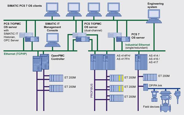 Мультиклиент и двухканальнаая фунциональностьДанные от разных частей системы могут отображаться на одном экране процесса на OS клиентах, как из контроллеров OpenPMC через Ethernet, так и из контроллеров SIMATIC PCS 7 через Industrial Ethernet. Это возможно благодаря архитектуре мультиклиента (multi-client), когда клиент может запрашивать данные с разных серверов. При малых конфигурациях также возможно использовать функции двойного канала PCS 7/OPMC OS Server .В этом случае, сервер осуществляет коммуникации с двумя системами через двухканальную DLL. |