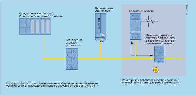 Распределенные системы автоматики безопасностиКонцепция построения систем автоматики безопасности на базе AS-Interface предусматривает возможность интеграции в AS-Interface специализированных компонентов автоматики безопасности (F-компонентов): кнопок экстренного отключения питания, концевых выключателей защитных дверей, защитные световые барьеры и т.д. Эти компоненты отвечают требованиям стандарта EN 50295 и полностью совместимы со стандартными компонентами AS-Interface (ведущими и ведомыми устройствами, блоками питания, повторителями и т.д.) и могут подключаться к системе управления с помощью желтого сетевого кабеля. Для управления сетью с F-компонентами используются стандартные ведущие устройства AS-Interface. Процедуры опроса ведомых устройств стандартного и F-исполнений полностью идентичны. Указанные особенности позволяют легко дополнять существующие сети AS-Interface компонентами автоматики безопасности. Информация из ведомых F-устройств передается в ведущее устройство только в информационных целях. Обработка F-сигналов выполняется в реле безопасности. Эти реле поддерживают алгоритмы перевода технологического оборудования в безопасные состояния и воздействуют на цепи питания этого оборудования через встроенные выходы. В зависимости от типа каждое реле безопасности может быть оснащено одним или двумя 2-канальными выходами. Реле безопасности осуществляет непрерывнй контроль обмена данными между ведущим и ведомымыми устройствами AS-Interface, выделяя из общего потока сообщений значения необходимых F-сигналов. Определение набора контролируемых F-сигналов и алгоритма их обработки производится с помощью программного обеспечения конфигурирования реле безопасности. Компоненты автоматики безопасности могут подключаться к любым точкам AS-Interface. В одной сети AS-Interface может использоваться несколько реле безопасности.В распределенных системах автоматики безопасности на основе AS-Interface с момента срабатывания датчика безопасности до формирования сигнала на перевод технологического оборудования в безопасные состояния требуется не более 40 мс.
