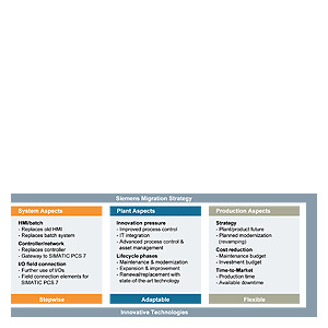 Плохое снабжение запасными частями, слабая техническая поддержка и необходимость внедрения новых функциональных расширений (сети полевого уровня, интеграция в мир IT технологий) могут стать основанием для комплексной модернизации сущестующей системы автоматизации на основе SIMATIC PCS 7. В целом ряде случаев модернизация может выполняться без остановки производственного процесса. Системы распределенного ввода-вывода, существующие сети, аппаратура и прикладное программное обеспечение могут продолжать использоваться и в новой системе.