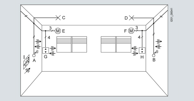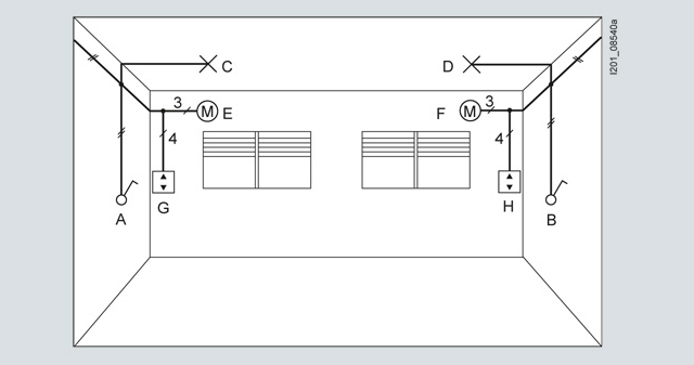 Замена электрических частей обычных выключателей (A, B) на• электрическую часть sys универсального диммера• клавишу Taste wave UP 210Замена обычных жалюзийных выключателей (G, H) на• электрическую часть sys устройства управления жалюзи• клавишу Taste wave жалюзи UP 211В результате этого• световой поток светильников C и D может регулироваться из точек A и/или B• жалюзи E и F могут управляться из точек G и/или HДля создания дополнительных возможностей управления светильниками и жалюзи можно инсталлировать• настенный передатчик с автономным питанием Batterie wave UP 110 (I) с насаженным на него• двойном кнопочным выключателем instabus KNX/EIB.