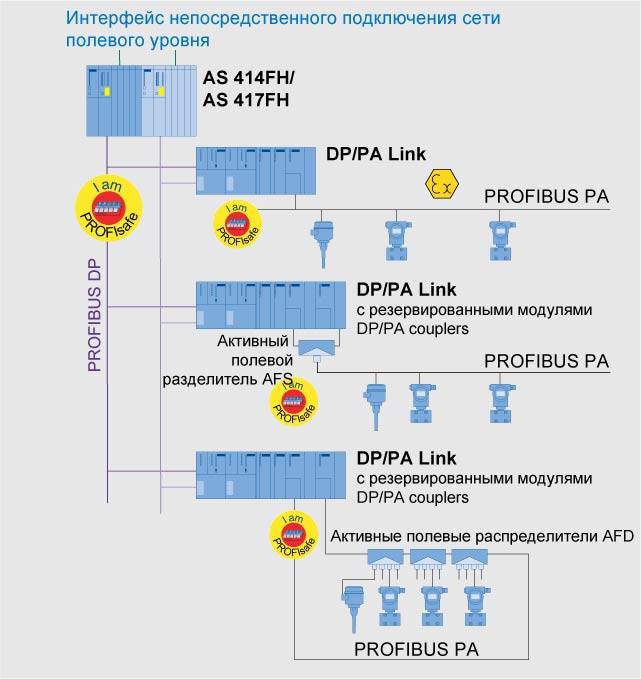 ДизайнПример конфигурации на PROFIBUS PA с использованием DP/PA link в качестве маршрутизатора Типовая версия конфигурации PROFIBUS PA представлена на рисунке. В этом примере DP/PA links используются в каждом случае в качестве DP/PA маршрутизаторов. До 5 DP/PA соединителей могут управляться DP/PA link. Смешанные конфигурации (напр. магистраль и кольцо на один link) также допускаются. DP/PA маршрутизатор может быть реализован и с помощью DP/PA соединителя. В этом случае PROFIBUS DP подсоединяется напрямую без дополнительного интерфейсного модуля. Линейная архитектура с нерезервированным соединителемКаждая линия PROFIBUS PA подключается к блоку DP/PA Link через свой модуль связи DP/PA Coupler. В зависимости от условий размещения приборов полевого уровня для этой цели могут использоваться модули FDC 157-0 (до Ex-зон 2) или DP/PA Coupler Ex [i] (до Ex-зон 1).DP/PA маршрутизатор может подключаться к обычной или резервированной PROFIBUS DP. Линейная архитектура с резервированным соединителемДля построения такой системы связи сегмент сети PROFIBUS PA подключается к двум модулям FDC 157-0 через активный полевой разделитель AFS. При этом модули FDC 157-0 могут устанавливаться в блок связи DP/PA Link с одним или двумя резервированными интерфейсными модулями IM 157. Разделитель AFS выполняет функции своеобразного коммутатора и обеспечивает автоматическое подключение линии PROFIBUS PA к активному модулю FDC 157-0 из данной резервированной пары. Гибкое модульное резервирование обепечивается группировкой устройств в различные PROFIBUS PA сегменты. Только одна PROFIBUS PA линия может подключаться через разделитель к одному DP/PA Link. PROFIBUS PA кольцо не может быть реализовано на этих средствах. Кольцевая архитектураКольцевая топология сети PROFIBUS PA строится на основе модулей FDC 157-0 и активных полевых распределителей AFD. В составе каждого кольца PROFIBUS PA может использоваться до 8 последовательно включенных модулей AFD. Каждый модуль AFD оснащен двумя портами для включения в кольцевую структуру сети PROFIBUS PA. Эти порты имеют встроенные автоматические терминальные устройства. Еще четыре порта ответвлений модуля AFD с защитой от коротких замыканий служат для подключения одного или нескольких приборов полевого уровня.. Следующие ограничения должны соблюдаться для PROFIBUS PA кольца в части подключения на него устройств PROFIBUS PA :