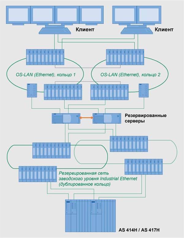 ДизайнВ различных SIMATIC PCS 7 подсистемах (ES, OS, AS и т.д.) используются разные коммуникационные интерфейсы: интегрированный сетевой контроллер, сетевая карта, специализированный коммуникационный процессор, например CP 1613. Соответствующий компонент определяется согласно требований (для дальнейшей информации см. "System connection for PCS 7 systems" ). Узлы, принимающие участие в коммуникациях, объединяются в сеть посредством Industrial Ethernet коммутаторов. Современные Industrial Ethernet коммутаторы семейства SCALANCE X особенно рекомендуются для этих целей, т.к. они обеспечивают масштабируемую производительность по привлекательной цене и поддерживают возможность разнообразных конфигураций. Возможно применение также и хорошо зарекомендовавших себя ESM и OSM коммутаторов. Пример конфигурации шины процесса и OS LAN на основе резервированного кольца OS-LAN (терминальная шина)Коммуникации клиент-сервер и сервер-сервер выполняются на выделенной Ethernet LAN. Сеть, называемая OS LAN или терминальная шина, может быть построена на основе стандартных SIMATIC NET компонентов, таких как коммутаторы, интегрированные сетевые контроллеры, сетевые карты, специализированные коммуникационные процессоры, кабели и т.д. При использовании кольцевой топологии, избегаются сетевые ошибки, связанные с повреждениями и разрывами сети. Для большего увеличения надежности OS‑LAN может быть организована в резервированное кольцо, содиненное 2 парами коммутаторов (см. пример конфигурации). Любой из резервированных серверов или клиенты могут быть подключены к обоим кольцам посредством отдельных интерфейсов (пакет резервированной терминальной шины). Стандартно трафик осуществляется по кольцу 1. Коммуникации по кольцу 2 активизируются только в случае ошибки на кольце 1. Industrial Ethernet процессная шинаСистемы автоматизации (AS) обмениваются данными друг с другом, со станцией разработчика, с операторскими системами (сервер/одноместные станции) посредством Industrial Ethernet процессной шины. Она строится аналогично OS‑LAN с использованием стандартных SIMATIC NET компонентов таких как коммутаторы, сетевые карты, коммуникационные процессоры(CP), кабели и т.д. В случае небольших заводов вплоть до 8 стандартных систем автоматизации , одноместные станции и сервера могут подключаться к сети с использованием "Basic Communication Ethernet" и FastEthernet сетевых карт. Коммуникационный процессор CP 1613 требуется всегда, если более 8 стандартных систем автоматизации или отказоустойчивая система используется. При повышении требований к надежности следует рассмотреть прежде всего кольцевую структуру сети. Если требования к надежности особенно высоки, процессная шина может быть сконфигурирована как двойное резервированное кольцо (два CPs на AS CPU и OS сервер). Двойные ошибки такие как ошибка коммутатора на кольце 1 с одновременным обрывом шинного кабеля на кольце 2 все еще не приведут к потере трафика. Два кольца физически разнесены друг от друга в такой конфигурации. Коммуникационные партнеры связаны логически друг с другом с использованием конфигурационного пакета NetPro с использованием отказоустойчивых S7 соединений (4‑кратное резервирование). Один SCALANCE X414‑3 коммутатор на каждом кольце принимает на себя функции менеджера резервирования. Замечание: | ||||||||||||||