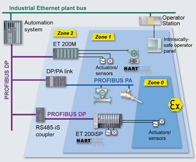 ДизайнПрименения различной периферии для работы в Ех-зонах.Данная картинка показывает различные возможности подключения сигналов из Ех зоны. Ex-модули ввода-вывода в станции ET 200M Вы можете разместить станции ET 200M в Ex-зоне 2. Также возможно реализация функции горячей замены в Ех-зоне 2. С помощью модулей со встроенными Ех барьерами Вы можете подключать датчики и исполнительные механизмы из Ех-зоны 1. Полевая сеть PROFIBUS-РА Полевая сеть PROFIBUS-PA сертифицирована для применения в Ех-зоне 1. Возможно подключать датчики и исполнительные механизмы, в том числе из Ех-зоны 0. Станция распределенной периферии ET 200iSP Станции распределенной периферии ET 200iSP могут быть непосредственно размещены в Ex-зоне 1 или 2 (EEx de ib [ia/ib] IIC T4) и подключать датчики и исполнительные механизмы, в том числе из Ех-зоны 0 Операторские панели Определенные типы операторских панелей могут использоваться при необходимости в в Ex-зоне 1 или 2. Для болле подробной информации см. каталог "Add Ons for the SIMATIC PCS 7 Process Control System". | ||||||||