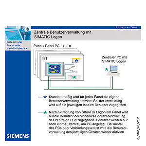 - Несколько лицензий SIMATIC Logon для WinCC flexible может быть загружено на центральную станцию, что увеличивает число станций WinCC flexible, которые могут быть связаны со станцией централизованного администрирования пользователей. Пример: Две лицензии по 10 подключений SIMATIC Logon для WinCC flexible дают возможность соединить 20 станций WinCC flexible со станций централизованного администрирования пользователей.