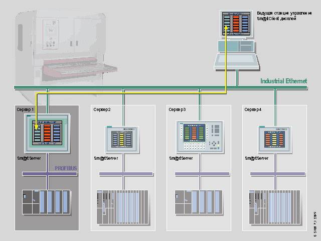 HMI приложение и коммуникация с контроллером происходят на ведущей станции. От нее могут быть активированы пространственно распределенные машины / установки, имеющие большое число устройств управления, так называемые Sm@rtClient, которые имеют доступ к ведущей станции и процессу.- Конфигурируемый графический объект (Sm@rtClient отображение) вставляется в графический экран соответствующей HMI системы (Sm@rtServer)