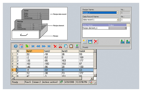 Рецепты и записи данных создаются отдельно с помощью удобного WinCC редактора проектирования. Конфигурируемый табличный объект позволяет отображать данные во время работы системы. Более того. Отдельные элементы записей данных можно отображать в полях ввода-вывода, расположенных на различных экранах отображения процесса.