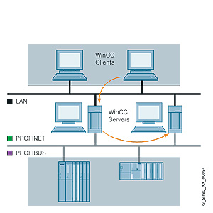 При сбое одного из серверов или станций WinCC второй(ая) берет на себя архивацию сообщений и технологических данных, обеспечивая тем самым целостность и непрерывность данных. В клиент-серверных архитектурах клиенты автоматически переключаются с отказавшего сервера на сервер-дублер, гарантируя непрерывность работы системы и доступность визуализации процесса с любого операторского терминала.