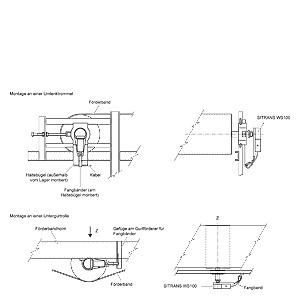 В датчике скорости SITRANS WS100 входной вал крепится к вращающемуся валу шкива (барабана), приводимому в действие лентой конвейера, с помощью резьбового соединения либо магнитного крепления. Входной вал является также опорой для корпуса датчика, не имеющего крепления к неподвижным элементам конструкции. Гибкий тормозной ремень не позволяет датчику вращаться вместе со шкивом, при этом не вызывая перегрузки подшипника, и может крепиться к любому жёсткому элементу конструкции конвейера вблизи датчика.
