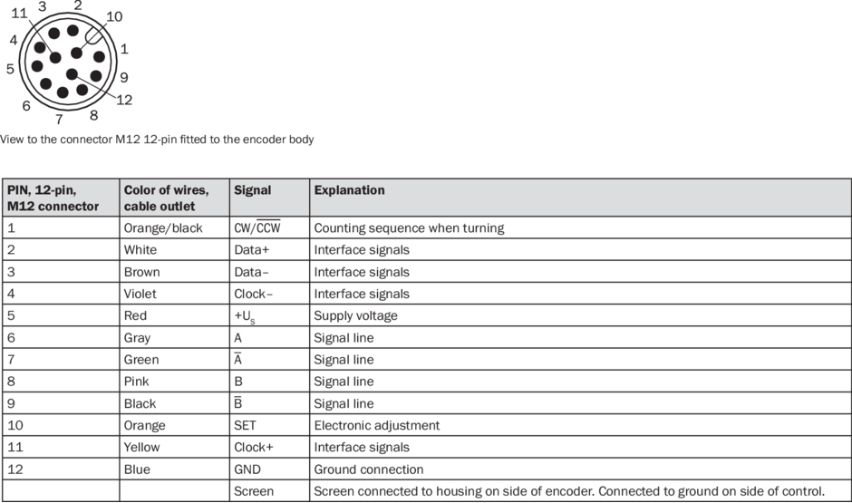 Схема контактов Разъем M12, 12-контактный и кабельное соединение, кабель 12-жильный, SSI/Gray + инкрементальный