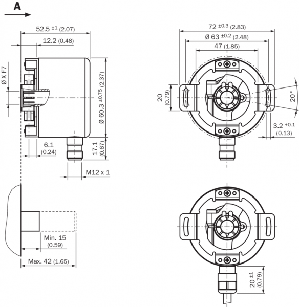 | Тип защиты | IP67, со стороны вала IP67, со стороны корпуса, отвод с разъемом, глухой полый вал, сплошной вал 2) IP67, кабельный отвод со стороны корпуса |