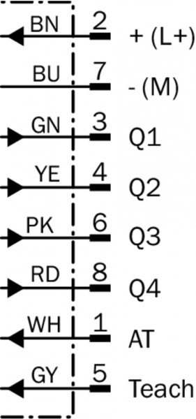 | Вход, настройка (ET) | PNP Teach: U = 10 V ... < UV Run: U < 2 V |