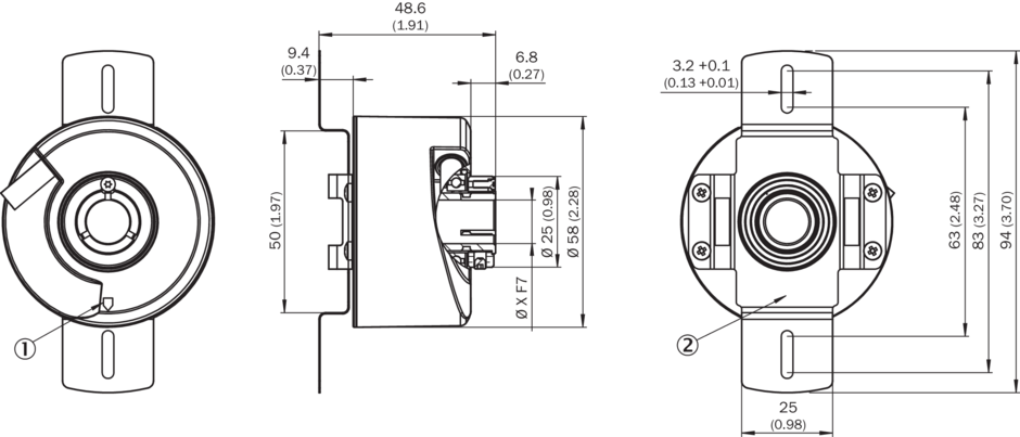 Габаритный чертеж Сквозной полый вал с зажимом сзади, кабельный ввод, статорная муфта 2-сторонняя, удлиненное отверстие, окружность центров отверстий 63–83 мм